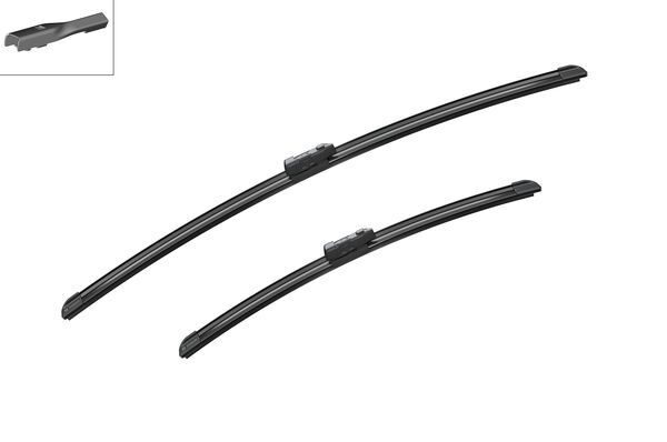 Sada dvou plochých stěračů BOSCH (řidič 650 + spolujezdec 450) se speciálním uchycením. Délky stěračů a systém uchycení na ramínko jsou přizpůsobeny vybraným vozům.