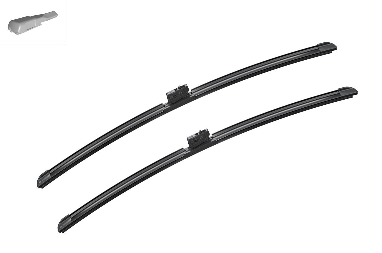 Sada dvou plochých stěračů BOSCH (řidič 600 + spolujezdec 475) se speciálním uchycením. Délky stěračů a systém uchycení na ramínko jsou přizpůsobeny vybraným vozům.