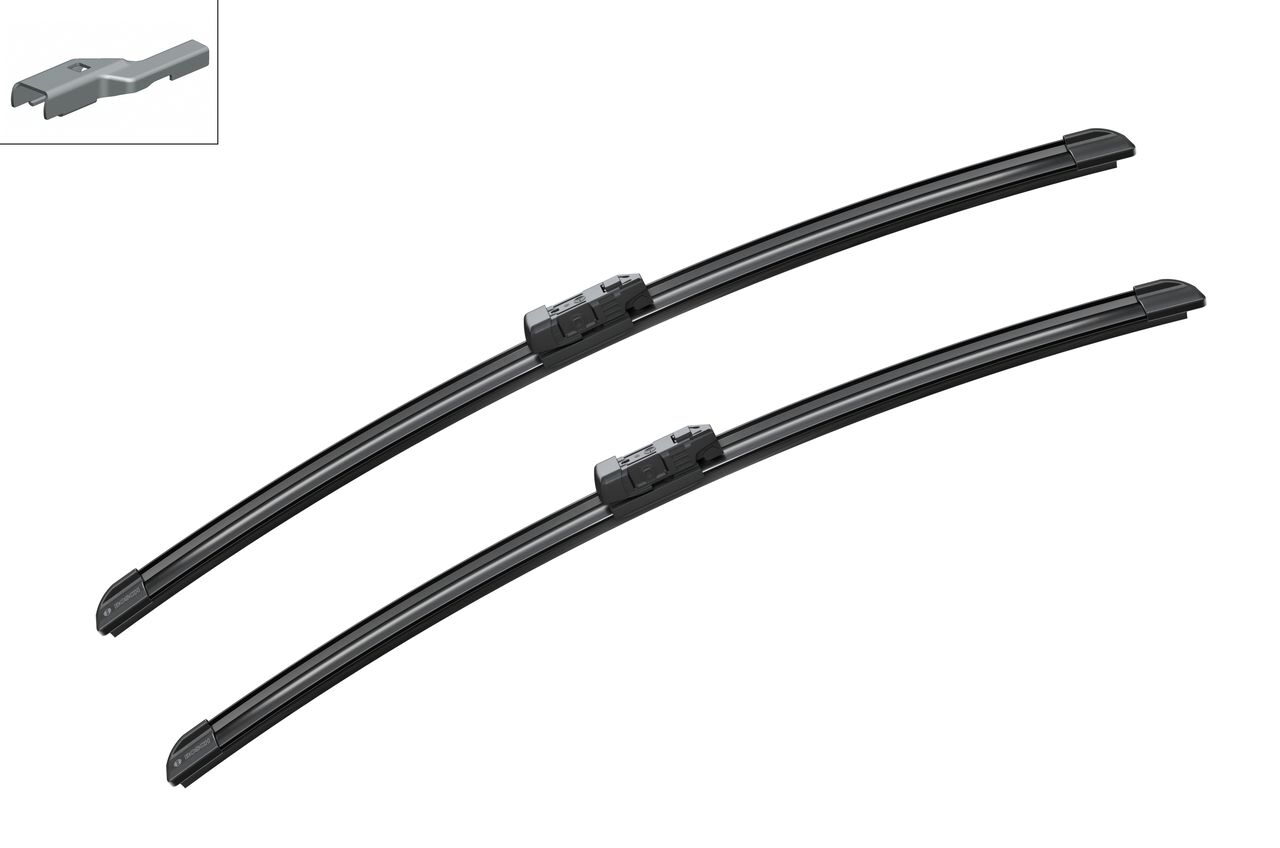 Sada dvou plochých stěračů BOSCH (řidič 650 + spolujezdec 650) se speciálním uchycením. Délky stěračů a systém uchycení na ramínko jsou přizpůsobeny vybraným vozům.