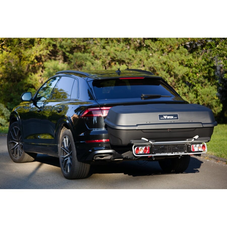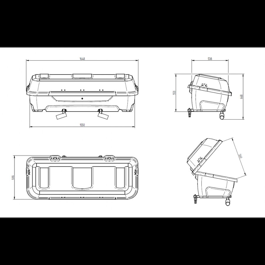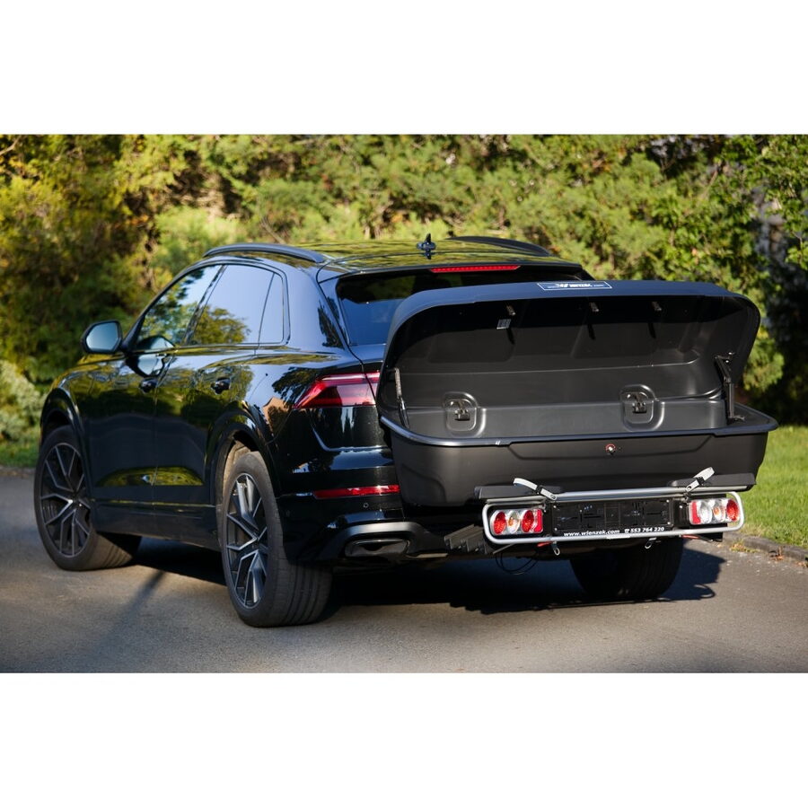 Transportní, uzamykatelný box pro převoz různých nákladů, montovatelný na nosič kol. Jedná se o širší provedení s větším otevřením oproti staršímu typu.