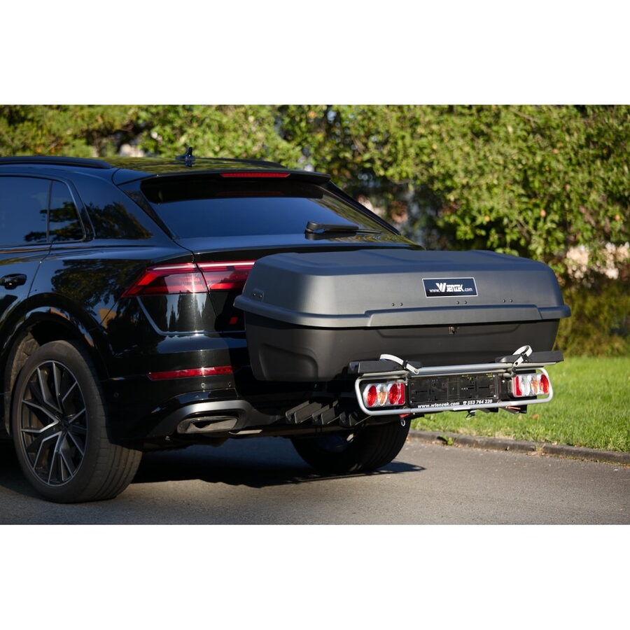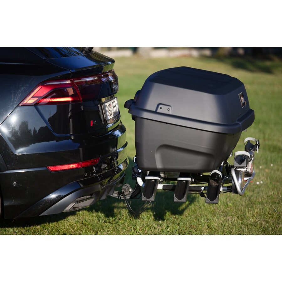 Transportní, uzamykatelný box pro převoz různých nákladů, montovatelný na nosič kol. Jedná se o širší provedení s větším otevřením oproti staršímu typu.