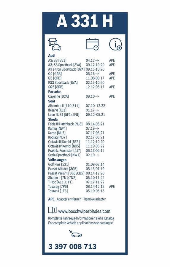 - Zadní stěrač POSCHE Cayenne (92A) r.v. 2010->, BOSCH TWIN 330 mm